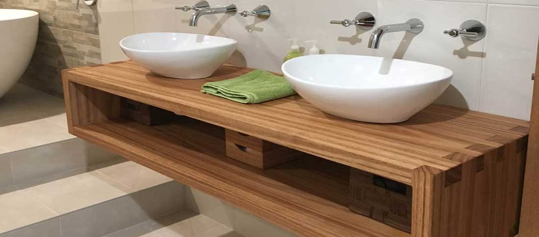 All our vanities are made from Australian solid timber,each one is individually hand crafted,we use traditional boxed joints on the draws,the entire draw is made from solid timber and built to last. We do not use timber veneer or thin flimsy material for the draw base. For Waterfall edges we use lag bolts to securely join the sides and top. Using a single timber slab to make the sides and top we can match the grain so it is a seamless match flowing from the top to the sides.